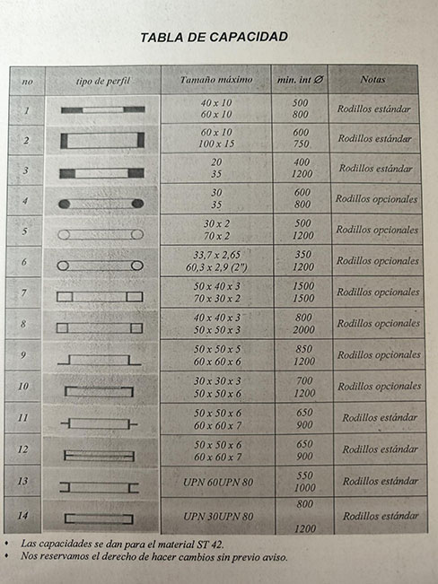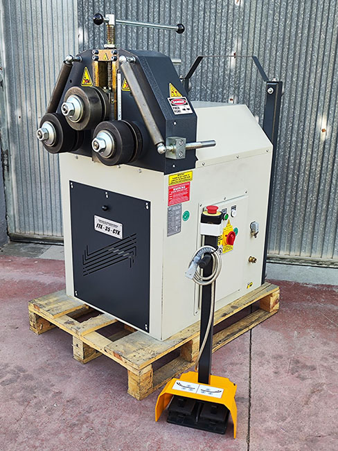 Curvadora de Perfiles (NUEVA) Vertical Horizontal Motorizada marca FORTEX modelo FTX-35-CTX Diámetro de Ejes 50 mm Diámetro de rodillos 155 mm Velocidad de Trabajo 4,5 m/min Potencia Motor 1,5 KW Voltaje 400 V Peso 400 Kg Medidas Largo 1000 mm Ancho 750 mm Alto 1400 mm Marco de Acero Dos Rodillos Accionados Rodillos Endurecido Los Ejes de Rodillos son de material de acero especial endurecidos y rectificados Pedal con Paro de Emergencia Nº de Maquina 39117 Marcado CE AÑO 2024