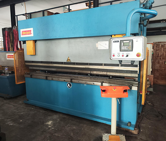 Pegadora Hidráulica marca BLECKEN modelo PPB 3100 Potencia 100 TN Con Posicionador de Cotas Digital Ejes Y-X Marca Unitronic modelo Vision 230 TM Capacidad 3240 Mm Entre montante 3100 Mm Escote Cuello de Cisne 500 Mm Carrera Regulable de 7 a 150 Mm Fuerza de retroceso 15 Tn Ancho de la Mesa 140 Mm Distancia mesa-trancha 350 mm Atura de Trabajo 870 mm Velocidad de aproximación 100 mm/seg Velocidad de trabajo 8 mm/seg Velocidad de subida 45 mm/seg Tope Motorizado Matriz Multíboca de 9 Posiciones Potencia Motor 5,5 KW Deposito de aceite 200 litros Nº De Fabricación 6636 Peso de la Maquina 7500 Kg Voltaje 380 VOLTS Con Normas de seguridad Marcado CE Año 2002