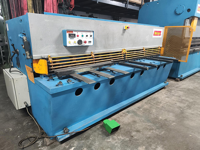Cizalla Hidráulica marca BLECKEN modelo CB-1030 B Longitud de corte 3100 Mm Espesor 10 Mm Cuello de cisne 310 Mm Tope Motorizado Profundidad del tope 875 Mm con Posicionador Digital Potencia del motor 15 KW Números de Pisadores 13 Medidas largo 3700 ancho 2100 Alto 1550 Mm Longitud de la escuadra 1100 Mm Peso 9.000 kg año 2002 Nº 6691 Con normas CE