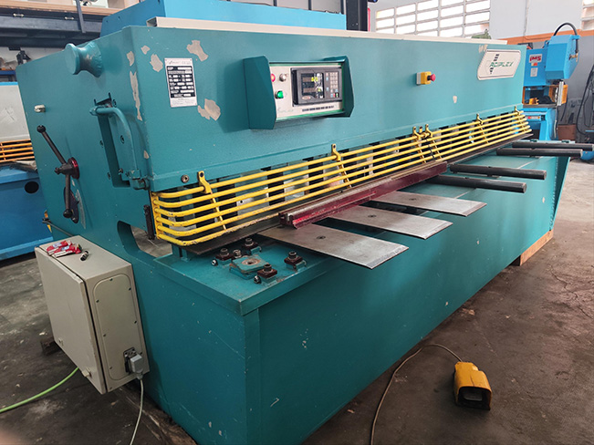 Cizalla Hidráulica marca ACIPLEX modelo 3100X10 Longitud de corte 3100 Mm Espesor 10 Mm Cuello de cisne 310 Mm Tope Motorizado Profundidad del tope 820 Mm con Posicionador Digital Marca FAGOR Potencia del motor 15 KW Números de Pisadores 13 Medidas largo 3700 ancho 2100 Alto 1550 Mm Longitud de la escuadra 1100 Mm Peso 9.000 kg año 2003 Nº 15710303 Con normas CEMarcado CE