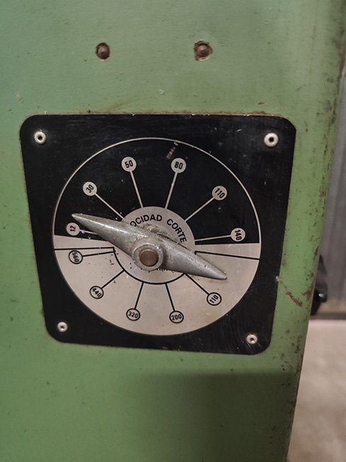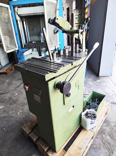 Chaveteadora marca CMR modelo EV-180 Diámetro máximo admisible sobre la mesa 700 mm Altura máxima a entallar 180 mm Espesor mínimo de la brocha 3 mm Espesor máximo de la brocha 20 mm Cursa de la brocha 100 mm Velocidad de corte 10 mts/min Motor reductor de 2 CV Reductor de tornillo sinfín con salida a 50 RPM Trifásica 380 V Peso aproximado 250 Kg Con variador de Velocidad Accesorios Centradores varios y 17 Cuchillas